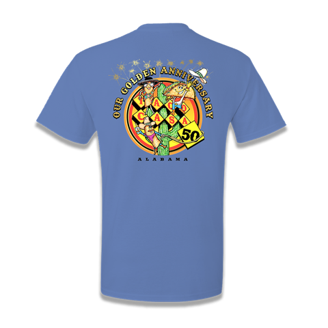 Celebrate half a century of delicious food with our exclusive 50th Anniversary T-shirt, a vibrant tribute to five decades of flavor and festivity at our beloved local Mexican restaurant. This short-sleeved marine colored tee features a convenient front pocket and showcases a lively design of jubilant cartoon mascots raising a toast to 50 years of culinary excellence. This limited-edition tee captures the spirit of our restaurant's journey, blending a splash of humor with a touch of nostalgia. Wear your love for your favorite Tuscaloosa restaurant with this commemorative anniversary shirt.